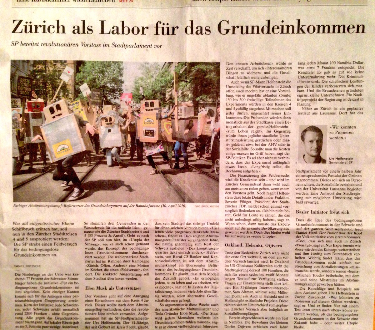 Die SP strebt einen Feldversuch für das bedingungslose Grundeinkommen in den Kreisen 4 und 5 in Zürich an, also genau an diesem Ort, wo das Grundeinkommen am 5.Juni bereits mit 54.7% angenommen wurde. Wir bleiben dran!